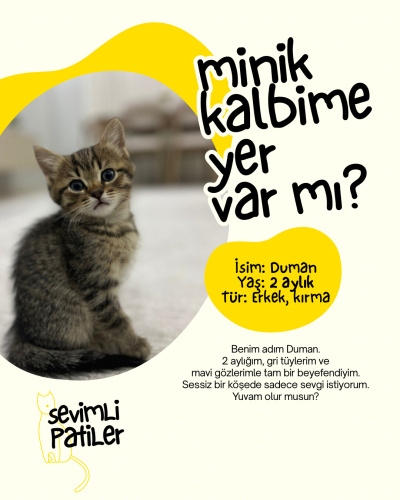 yavrumuz 2,5 aylıktır. Cinsiyeti erkektir. Kendi kedimiz evde doğum yaptı bizzat yavrularla kendimiz ilgilendik. Kum eğitimi vardır. Mamaya geçiş sağlandı. Gerçekten güvendiğimiz samimi gelen insanlara sahiplendirmek istiyoruz.