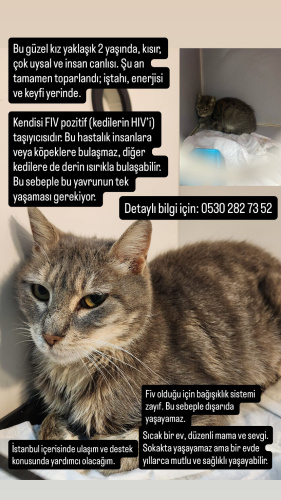 Yaklaşık 2 yaşında, kısır, dişi sokak kedisi. 3 haftadır veterinerde. FIV taşıyıcısı olduğundan ötürü bağışıklık sistemi diğer sağlıklı kedilere göre düşük. Bu sebeple dışarıda sürekli hasta oluyor. Ona sevgi ve sıcak bir yuva olabilecek merhametli bir sahibe ihtiyacı var. Yalnız yaşaması gerekiyor. Diğer kedilerinize derin ısırma yolu ile FIV bulaştırabilir. Eğer sahiplenirseniz ömrü boyunca sadece bu bebeğe bakma sorumluluğunu alacaksınız. Diğer çocukların hakkına girmeyin lütfen. Biz de bu sebeple sahiplenemiyoruz. Tek yaşaması gerekiyor. Yapılması gereken ona sıcak bir yuva ve bolca sevgi vermek. Belli düzenlerle kontrole götürmenize veya kullanması gereken bir ilaç bulunmamakta. Normal bir kedi gibi yaşayabilir. Sokakta kalırsa tekrar hasta olup ölebilir. Çok emek harcadık, lütfen bu güzelliğe yuva bulalım. Ben ulaşım, mama, diğer ihtiyaçları için yardımda bulunacağım. Artık klinikteki kafesten çıkması gerekiyor.
