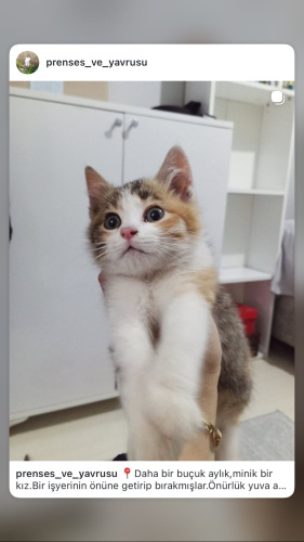 Bir buçuk aylık,dişi,çok sevecen,uslu,iş yeri önüne bırakılmış.Geçici yuvadan İzmit ,İstanbul civarına sahiplendirilecek