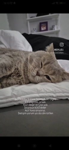 Dobby 2,5 yaşında. Tüm aşıları düzenli yapıldı, sağlıklı ve çok uysal bir kedidir. Yaşlı bir karı koca çift Dobby i sahiplendi fakat daha fazla bakamadıkları için sokağa bıraktılar. Şu an geçici evinde Dobby ömürlük ailesine kavusmayı bekliyor. Üreticilerin eline geçmesini engellemek için ilk şartimiz kısırlaştırma ve çip takılmasıdır. Bunun dışında bir istegimiz yoktur. Ara sıra takip şartıyla ücretsiz sahiplendireceğiz. Lütfen kedi bakmanın maddi manevi sorumluluğunu bilen, sorumluluk sahibi sevgi dolu, vicdanlı insanlar arasınlar. Çocuğuna oyuncak için geçici hevesli niyeti olanlar aramasın. Gerçek hayvansever aileler bu numarayı arayabilir: 0 530 468 38 70