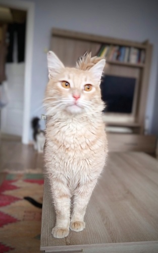 30 kedili bir evde koyacak yer kalmadığı için ne yazık ki evin tuvaletine konuldu, çok sıkılıyor. Çok çok güzel huylu. Tek isteği artık özgürce gezebileceği bir evi, sevileceği melek gibi ailesi ve hiç terkedilmemek. Pofuduk bir kedi. Çok ürktüğü için fotoğraflarını iyi çekemedik. Çekmeköy/İstanbul