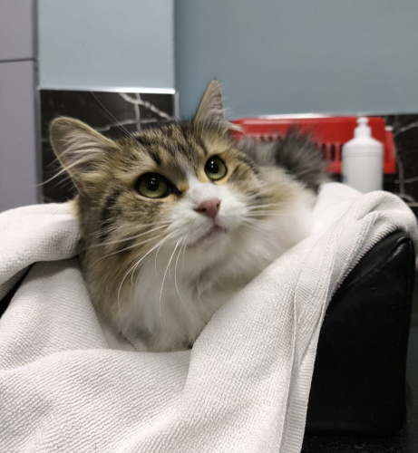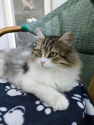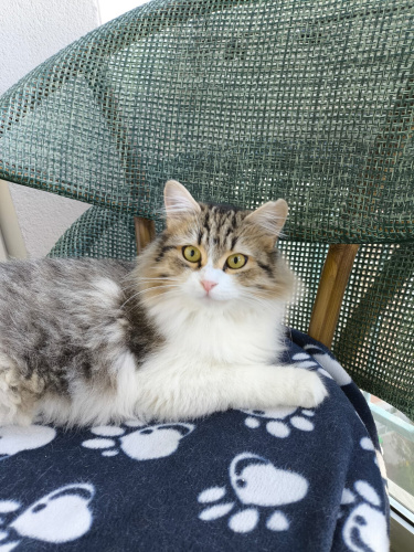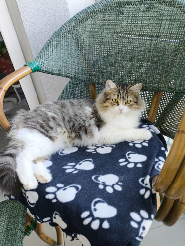 Çok uslu, sakin karakterli ve iyi huyludur. İnsanlarla uyumu çok iyi, kucağı ve sevilmeyi çok seviyor. Kısırlaştırıldı, yuvasını arıyor. 9-10 aylık civarı. Evde 6 kedi olduğu için ben sahiplenemiyorum artık.
