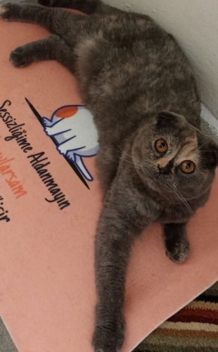 Scootish fold cinsi dişi kedi. 1 yaş 10 aylık. Kısır. Aşısız. Çok sakin ve akıllı bir ev kedisi. Oyun oynamayı sever. Dışarıya alışkın değil. Sorumluluğunun alınacağı, sevileceği ve ihtiyaçlarının giderileceği ömürlük yuvasını arıyoruz. Takip şartıyla sahiplendirilecektir. Sahiplenmek için iletişime geçin.
