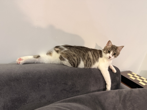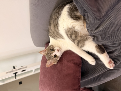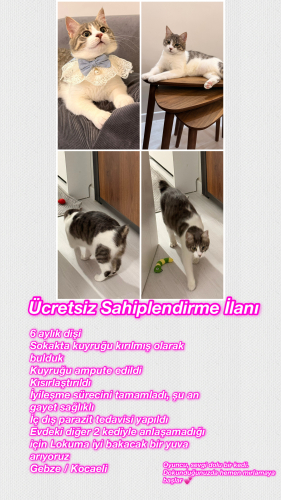 Sokakta baktığımız bir kediydi. Kuyruğunu kırılmış görünce tedavi ettirdik, ampute oldu. Kısırlaştırdık. İyileşme evresi tamamlandı. İç dış parazit yapıldı. Bir sağlık problemi yok. Ona iyi bakacak bir yuva arıyoruz