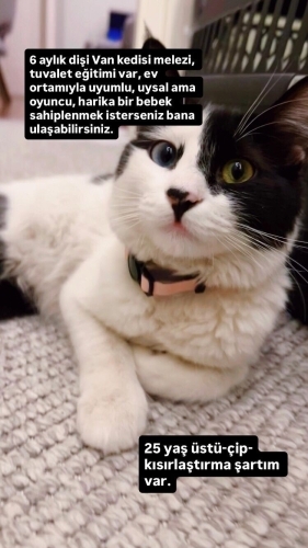 Kapımızın önünde bulduğumuz yaklaşık 6 aylık dişi bu güzel kız için kalıcı ve sevgi dolu bir yuva arıyoruz. Sokakta tek başınaydı ve bir ev kedisi olabileceğini düşündüğümüz için terk edilmiş olabileceğini düşünüyoruz. Bir gözü mavi, bir gözü yeşil, van kedisi melezi💙💚 Çok uysal, insan canlısı ve sevecen. Ev ortamına hızlı adapte oldu ve sakin bir karakteri var.