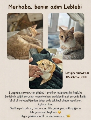 Merhaba benim adım Leblebi. 5 yaşında, sarman, tek gözünü 1 aylıkken kaybetmiş bir kediyim. Sahibimin sağlık sorunları nedeniyle beni sahiplendirmek zorunda kaldı. Viral bir rahatsızlığımdan dolayı evde tek kedi olmam gerekiyor. Aşılarım tam. Sevilmeye bayılırım, dokunmana bile gerek yaklaştığında bile gırlamaya başlarım🫠 Diğer gözümde artık siz olur musunuz ? 🙃