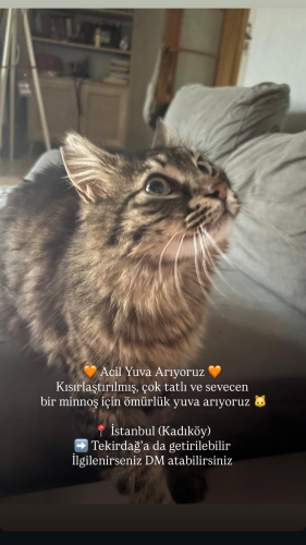 Evden kaçmış ya da atılmış olabiliceğini düşündüğüm çok tatlı, sevecen, uysal kendini sevdiren bir kedi. Dişi ve kısır. Güzel bir kalıcı yuva arıyorum