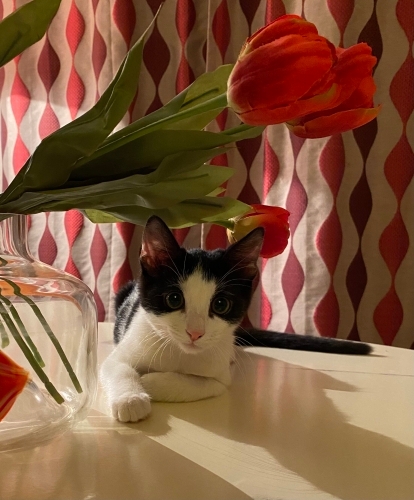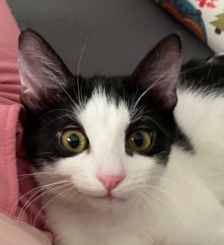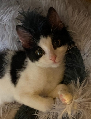 Darwin yaklaşık 4 aylık, siyah-beyaz smokin, erkek bir kedi. Sokaktan kurtarıldı; tedavileri tamamlandı, aşılarına başlandı (ilk karma ve ilk lösemi aşısı yapıldı).