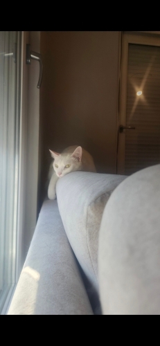 Askere gideceğim için sahiplendiriyorum. Antalya konumunda, Ankara Irkı, Sağır, Dişi,Kısırlaştırılmış, 4 yaşındadır Çipli ve aşıları yapılıdır. Arka sol patisinde bir parmağı yok. Sağır olduğu için biraz korkarktır.