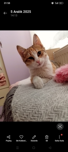 Kavunu küçükken sokakta gözü hasta halde aldım tedavilerini oldu. Ev ortamında aşılarını olarak büyüdü. Veteriner kontrolleri oldu. Şu an çok sağlıklı bir kedi, sağ gözünde hafif bir beyazlık var ancak geçmeyecekmiş, görüyor o gözüde. Oyuncu ve diğer kedilerle anlaşması iyi. Evin ikinci bebeği olabilir. Kavun şu an 6 aylık. Ona huzurlu bir yuva olabilecek, veteriner kontrolü düzenli yapılacak ve çok sevileceği yeni yuvasını arıyoruz. İletişim için mesaj atınız