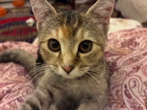 geçici evinde, üç renkli, veterinerde muayenesi ve ilk parazit aşıları yapılmış , tuvaletini kuma yapan, insanla konulur gibi seslenen , çocuklarla anlaşan, saldırma huyu olmayan, oyun oynamayı seven, genellikle temasla uyuyan ve kendini çok sevdiren mırıl mırıl yavru yuva arıyor. Evde yaşamaya alışkın ve insanlarla iletişiminden dolayı evden kaçmış olabileceğini düşünüyoruz.Ancak yuvasını bulamadık.Yeni yuvasını arıyor.