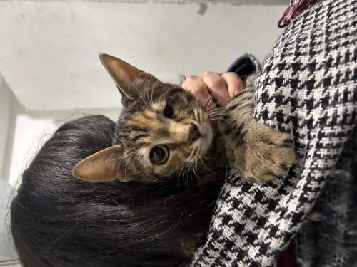Tahmini 3-4 aylık tekir sarman mix dişi kedi. Kendisini 2-3 ay önce sokakta bulduk, bir gözü büyümüş ve enfektifti. O zamandan beri klinikte tedavi gördü ve gözü boyut olarak ağrı vermeyecek noktaya getirebildik. Şuan tek ihtiyacı ona açılacak sıcak bir yuva. Genel durumu iyi sadece uzun süredir klinikte olduğundan oldukça korkak bir çocuk. Takip ve büyüdüğünde kısırlaştırma şartı ile yuva arıyoruz.