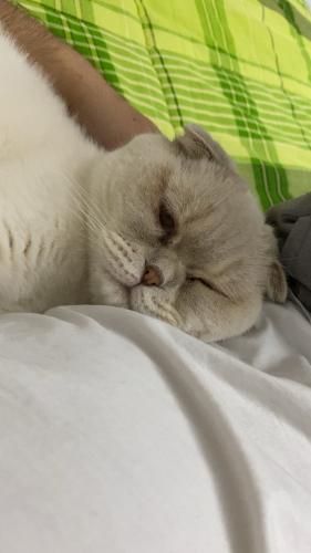 alerjim olması nedeniyle sahiplendiriyorum zaten genelde uyur sakindir ve uysaldır biraz korkak sadece.