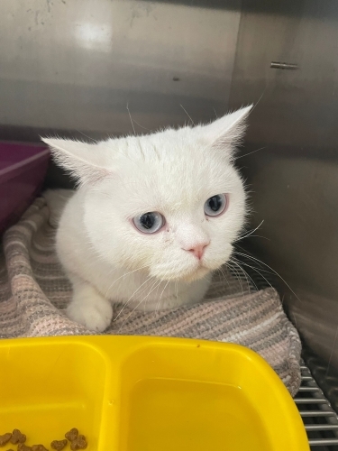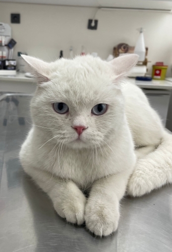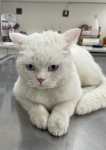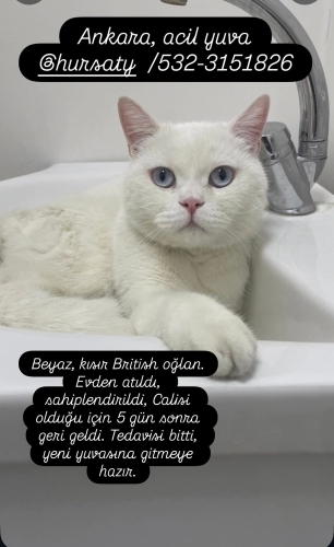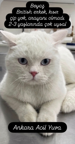Beyaz; 2 -3 yaş civarı sağlıklı ve sakin bir oğlan. Cinsi: British. İç-dış paraziti yapıldı. Kum eğitimi var. Kuru ve yaş mama yiyor. Kısır. İnsan canlısı, sakin ve sevgi dolu, dokunduğunuzda gurlamaya başlıyor.