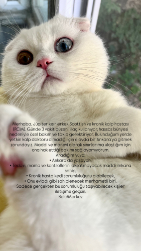Merhaba, Jüpiter kısır erkek Scottish ve kronik kalp hastası (RCM). Günde 3 vakit düzenli ilaç kullanıyor, hassas bünyesi nedeniyle özel bakım ve takip gerektiriyor. Bulunduğum yerde yetkin kalp doktoru olmadığı için 6 ayda bir Ankara’ya gitmek zorundayız. Maddi ve manevi olarak sınırlarıma ulaştığım için ona hak ettiği bakımı sağlayamıyorum. Aradığım yuva: • Mümkünse kalp doktoruna yakınlık için Ankara’da yaşayan, • Tedavi, mama ve kontrollerini aksatmayacak maddi imkana sahip, • Kronik hasta kedi sorumluluğunu alabilecek, • Onu evladı gibi sahiplenecek merhametli biri. Sadece gerçekten bu sorumluluğu taşıyabilecek kişiler iletişime geçsin. Bolu/Merkez