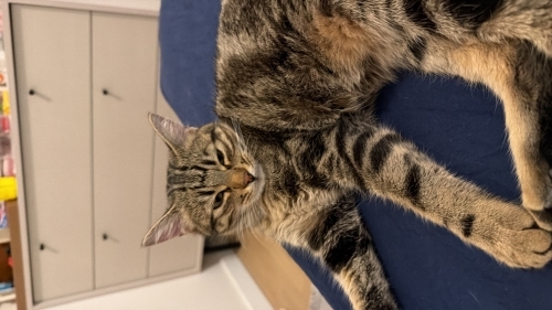 Ağaçtan düşüp kalçasını ve patisini kırdı, amelyat olup platin takıldı, tamamen sağlığına kavuştu. Önceleri hüzünlü bakan gözleri sağlığına kavuşunca sıcacık bakmaya başladı, yerinde duramayan kucağa atlayan gurul gurul bir bebeğe dönüștü. 8 aylık erkek, parazit aşıları yapıldı, karma ve kuduz aşıları da yapıldı, kuru mama yiyebiliyor, kısırlaştırıldı. Oyuncu, temas bağımlısı çok uysal bir çocuk. Insanlarla ve diğer kedilerle anlaşabiliyor, tırmalama huyu yok, eve ikinci kedi olarak da alınabilir. Bu güzel oğlanı takip, çip ve pencerelerde koruyucu file/tel sartıvla sahiplendireceğiz. Ona vuva olmak isterseniz