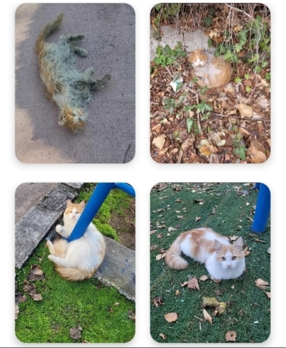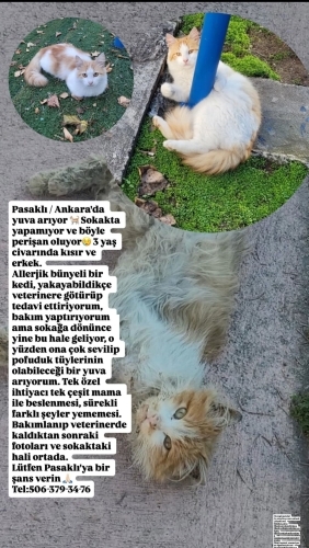 Sokakta yapamıyor ve böyle perişan oluyor😢 3 yaş civarında kısır ve erkek. Allerjik bünyeli bir kedi, yakayabildikçe veterinere götürüp tedavi ettiriyorum, bakım yaptırıyorum ama sokağa dönünce yine bu hale geliyor, o yüzden ona çok sevilip pofuduk tüylerinin olabileceği bir yuva arıyorum. Tek özel ihtiyacı tek çeşit mama ile beslenmesi, sürekli farklı şeyler yememesi. Bakımlanıp veterinerde kaldıktan sonraki fotoları ve sokaktaki hali ortada. Lütfen Pasaklı'ya bir şans verin 🙏🏻