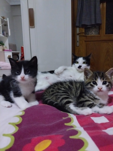 Şuan geçici yuvasında olan anne kedi ve yavrularına kalıcı yuva arıyoruz. Önceliğimiz bir arada olmaları ama gerekirse ayrı sahiplendirilecektir. Anne kedi 1 yaş civarında, yavruların ikisi de erkek ve yaklaşık 2 aylık. Hepsinin kum alışkanlığı var. Yavru kediler kuru mamaya geçtiler. Hiçbir aşıları yapılmadı.