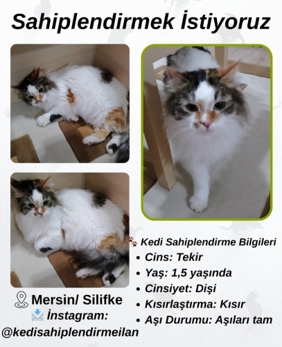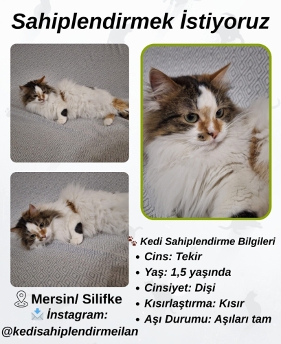 Güzel kedimizi sahiplendirmek istiyoruz. 7 tane kedimiz olduğu için bakmak çok zorlaştı. Kendisine ömürlük, kendisini öz yavrusu gibi görecek iyi sahipler arıyoruz. Kendisi o kadar minnoştur ki sizi görür görmez göbüşünü açar, size minnoşluk yapar. Çok tatlı, minnoş ve cana yakındır. Kendisini çok güzel sevdirir. Artık maddi olarak yetişemediğimiz için ona ömürlük yuva arıyoruz.