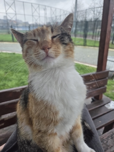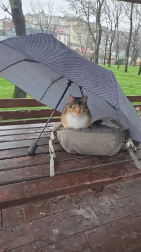 Kağıthane Hasbahçe parkında yaşıyor. Kısır, uysal, kendini sevdiriyor. Yağmurda gidecek bir yeri yok.