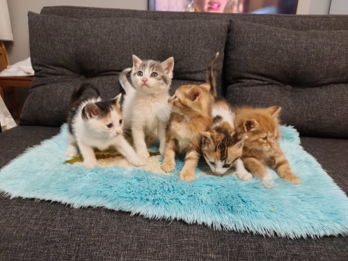 Yağmurda anneleri ile sırılsıklam bulunup bi kaç günlük korumaya alındılar. Alan kişi taşınıyor, fazla zamanları yok, bi kaç güne geri sokağa gidecekler. 3 erkek, 2 dişi. Tahmini 1.5 aylıklar