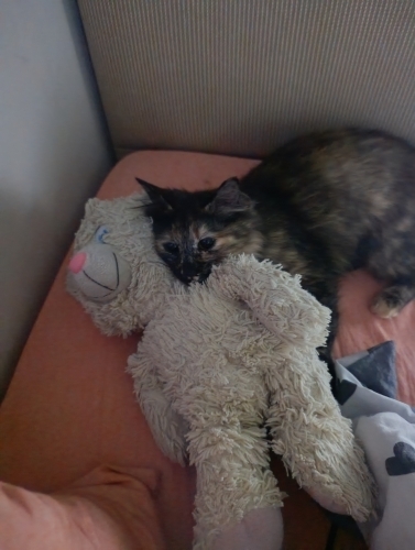 Tortoiseshell (kaplumbağa kabuğu) desenli, çok özel ve tatlı bir kedi. İnsanlara alışık, ev ortamında yaşamaya uygun, oyuncu ve sevecen bir kedidir. Tuvalet eğitimi vardır. Aşıları tamdır, kısırlaştirilmistir. Sadece bir doz karma aşısı mevcuttur. Kardeşiyle birlikte yaşıyor ikisi birlikte sahiplenilirse daha güzel olur diye düşünüyorum.