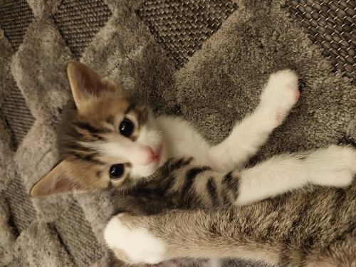 Beyaz, gri ve turuncu tüyleri var. 1 aylık olduğu için henüz kısırlaştırılmadı ve aşılanmadı. Kum eğitimi alıyor. Sütten kesildiği zaman sahiplendirilecek.