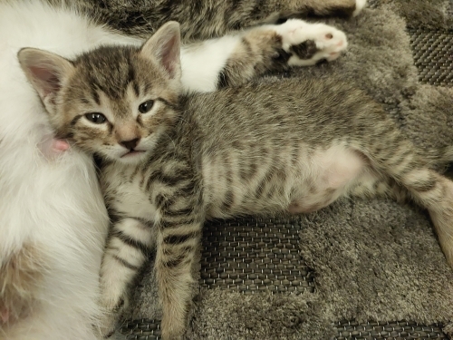 Siyah ve gri tüyleri var. 1 aylık olduğu için henüz kısırlaştırılmadı ve aşılanmadı. Kum eğitimi alıyor. Sütten kesildiği zaman sahiplendirilecek.