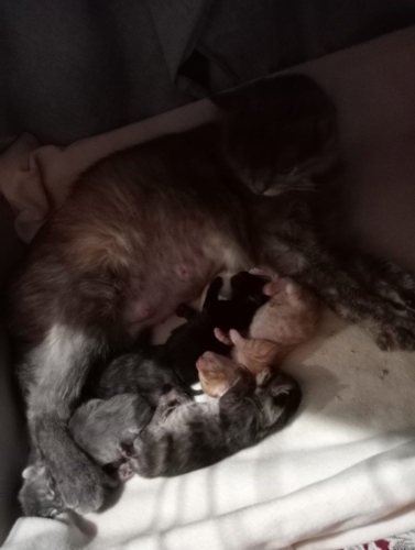 Mırmır yaklaşık 1 yaşında, ailemin evine gece 3 te geldi ve ayrılmadı biz de onu bırakmak istemedik. Geldiğinde çok temizdi, insana çok alışıktı, evden kaçmış olabileceğini düşündük. Çipi yoktu. Bir süre sonra mırmırın hamile olduğunu farkettik şimdi çok güzel 5 tane bebişimiz var fakat ben doğum yapacağım ve evde bir kedi 2 kuşumuz olduğu için aynı ortamda bir araya getiremiyoruz. Zaruri durumumuz geçene kadar anne ve bebeklerin güvenle büyüyebileceği 15-20 gün kadar bize yardımcı olabilecek geçici yuva bebişler sütten mamaya geçince kalıcı yuva arıyoruz.