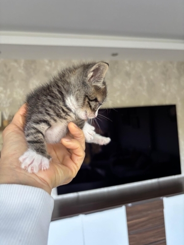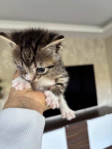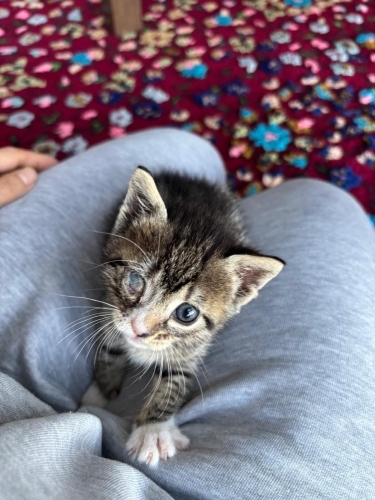 Tahmini 1 haftalıkken bulundu. Göz için tedavi uygulandı ama malesef kurtarılamadı. Dişleri çıkmaya başladı. Yakında yavru kedi maması yiyebilir. Maksimum 3 haftalık oldu. İnsana aşırı düşkün, kucaktan inmek istemiyor. Kafeste sürekli ağlıyor ve çıkmak için tırmalıyor. Kucağa gelince tamamen rahatlıyor, gurlamaya başlıyor. Mırıl mırıl, sevgi dolu dişi bebek için ömürlük yuva arıyoruz.