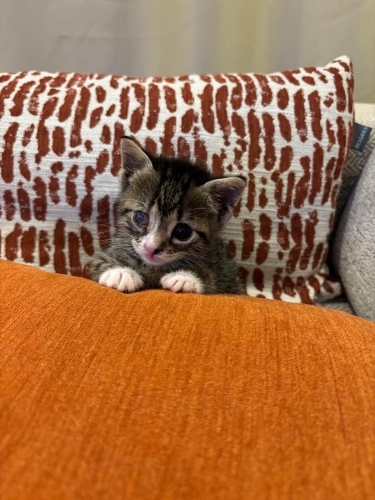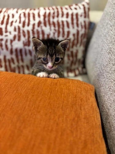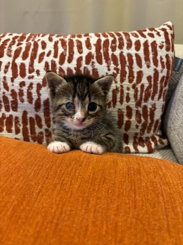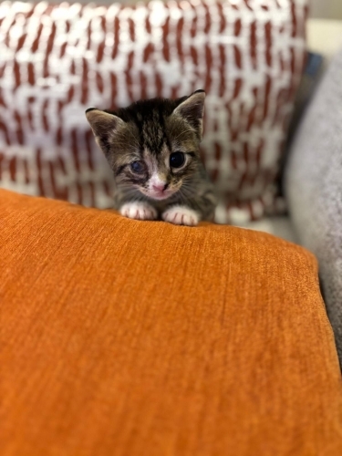 Tahmini 1 haftalıkken bulundu. Göz için tedavi uygulandı, daha iyiye gidiyor ama malesef kurtarılamadı. Dişleri çıkmaya başladı. Yakında yavru kedi maması yiyebilir. Maksimum 3, 5 haftalık oldu. İnsana aşırı düşkün, kucaktan inmek istemiyor. Kafeste sürekli ağlıyor ve çıkmak için tırmalıyor. Kucağa gelince tamamen rahatlıyor, gurlamaya başlıyor. Mırıl mırıl, sevgi dolu dişi bebek için ömürlük yuva arıyoruz.