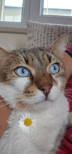 Ben ona Bodrumda aşık oldum ve 2 sene evvel eve getirdim. O renk bir mavi gözün bu cons bir kedide olmasi imkansiz dedi veteriner. Bir ara puma yavrusu mu aldim acaba dedim. Dünyada daha sakin ve oturduğu yerden kalkmayan bir kedi görmedim. Ne yazık ki 2 senedir olan olağanüstü cabalarima rağmen evde olan diğer kedimle anlaşamadı, degilanlasamamak ayni yerde bile duramiyor ve ne yazık ki bu guzel kedi baska odada yaşamak zorunda. Kesinlikle evinde baska bir kedi veya kopek olmayan ve kucağına alik saatlerce kedi sevmek isteyen , hatta gezmeye çıkarıp kutusunun kapağını açtığında bile kacmayacak sakinlikte bir kedi arıyorsanız, ne tırmalama, ne yaramazlık, sadece kendinden baska bir hayvana tahammulu olmayan bir can bu. Üzülüyorum ama onu daha fazla o odada tutamam.