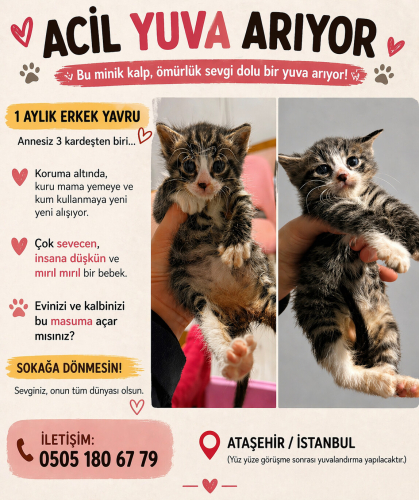 Annesiz 3 kardeşten 1 tanesi . İnsana düşkün, sevgi dolu , kucakta mayışan bir bebek . Ona sahip çıkacak ömürlük yuvasını arıyor