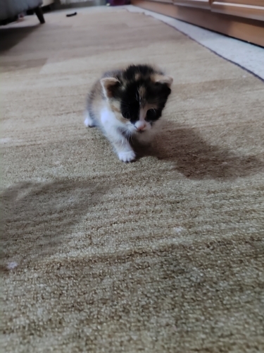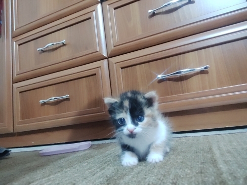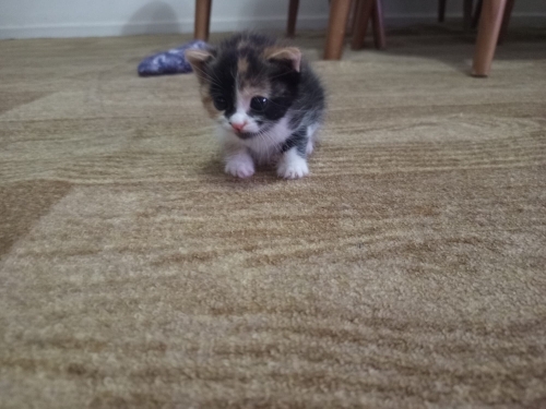 Henüz bebek olan bu güzeller güzeli kızımız, çok nadir bulunan Kaliko (üç renkli) desenlerine sahip.Çok narin, sessiz ve sevgi dolu. Diğer baskın kedilerin yanında ezilmeyecek, ona pamuklar içinde bakacak bir aile arıyoruz. 4 haftalık tahmini. Çok acil yuva lazım