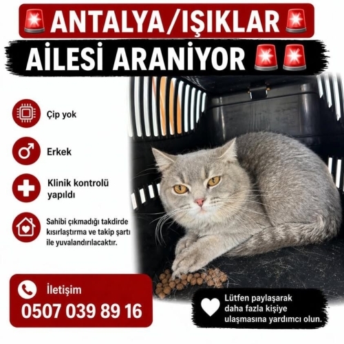 Gece saatlerinde Antalya Işıklar Caddesinde buldum veterinere götürdüm fakat çipinin olmadığını söyledi evde hamile bir kedim ve de onun eşi mevcut kaybeden ya da sahiplenmek isteyen olursa yardımcı olmak istiyorum (Kısırlaştırılmamış Çipi Yok )
