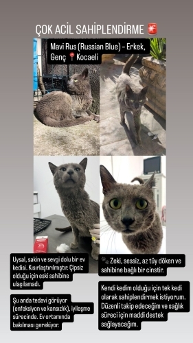 Kısır 1 yaşında Erkek Russian Blue Kedi sokakta bakımsız, enfeksiyonlu ve susuz vaziyette bulup tedavi ettirdim, veteriner tarafından evdeki kedimle yan yana bakılması önerilmediği için sahiplendirmek zorundayım ancak kimseden bir ses çıkmadı. Tekrar sokağa bırakacağım için içim parçalanıyor ancak başka çarem kalmadı, Pazartesiye kadar vaktim var. Şu an çok iyi durumda, Bu çocuğa bir yardım eli uzatın nolur, detaylar için iletişime geçebilirsiniz, belli bir süre için bir kısım ilaç masrafları tarafımdan karşılanacaktır.. (virüsü olduğu için evde tek kedi olarak bakılmalı, insana, çocuğa zararlı bir virüs değil)