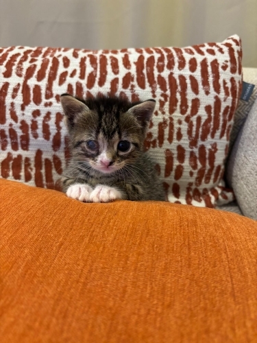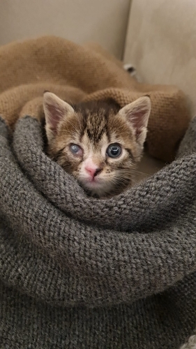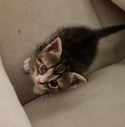 Tahmini 1 haftalıkken bulundu. Şimdi 35-40 günlük oldu. Göz için tedavi uygulandı, daha iyiye gidiyor ama malesef kurtarılamadı. İnsana aşırı düşkün, kucaktan inmek istemiyor. Kedilerle de çok uyumlu, çok sosyal ve oyuncu. Kuru mama yiyor , kum kullanıyor. Mırıl mırıl, sevgi dolu dişi bebek için ömürlük yuva arıyoruz.