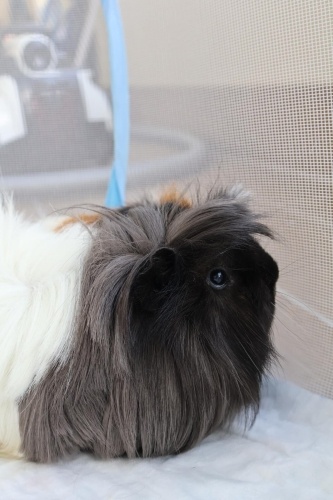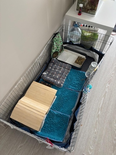 Paylaştığım fotoğraflardan biri, tüyleri yeni kesilmiş hâline aittir. Paylaştığım görsellerden biri de kafesine aittir. Fotoğraftaki iç düzen birebir aynı olmayabilir; ancak sahiplendirme kafesiyle birlikte yapılacaktır. Kafes ölçüleri 120 cm uzunluk, 60 cm en şeklindedir. Bu ölçüler ginepig sağlığı ve hareket alanı için minimum gerekliliktir; daha küçük kafeslerde bakımı uygun değildir.