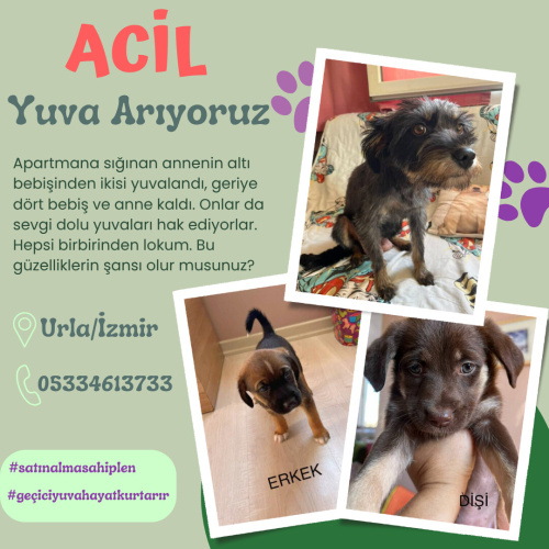 Apartmana sığınan annenin altı bebişinden ikisi yuvalandı, geriye dört bebiş ve anne kaldı. Onlar da sevgi dolu yuvaları hak ediyorlar. Hepsi birbirinden lokum. Bu güzelliklerin şansı olur musunuz? İYTE Hayvan Dostları Topluluğu olarak patili dostlarımızın güvende olmaları için çabalayan, elimizden geldiğince onların ihtiyaçlarına koşan gönüllü öğrencileriz. Sahiplendirme ilanlarımıza ve diğer tüm paylaşımlarımıza https://www.instagram.com/iytehaydos/ buradan da ulaşabilirsiniz.