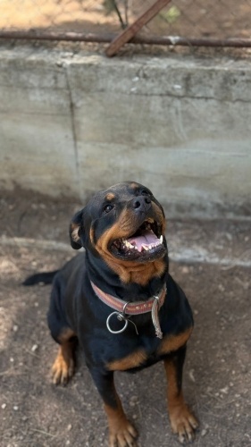 Nalan, rottweiler, 2 yaşında, dişi-kısır. Tuvalet eğitimi var, komutları biliyor eğitilmiş daha önce. Evde yaşamaya da korunaklı bahçede yaşamaya da uygun fakat kedi köpekle olmaz tek olması gerek