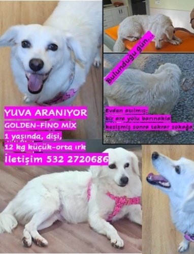 " 1 yaşına yeni girmiş, 12 kilo, sevgi dolu, sessiz, eğitimli, uyumlu bir kız. Evden atılmış olabileceğine inanmıyorum, hani neden!!!!, Belki de kayboldu. Havlama huyu hiç yok, bahçeye yaklaşanı buff buff diye kısık bir sesle haber veriyor. Tasmalı ya da tasmasız yanımda ben yürüyünce yürüyor, ben durunca duruyor. Ben çalışırken yanımda uysalca yatıyor, ben hareketlenince coşuyor, akşamları sanki işimin bittiğini anlayıp oyun oynamak istiyor. Evdeki kedilerle hiç sorun olmadı. Büyük köpeklerden ve kalabalık erkek insanlardan korkuyor. Tuvalet eğitimi kusursuz, dışarda da yola kaldırıma yapmayıp toprağa yapıyor. Evde koltuklara çıkmayı bırakın çağırmadan kanepeye yaklaşmıyor bile. Gece boyunca kendine ayrılan yerde uyuyor. Öyle tatlı öyle uyumlu ki.… "
