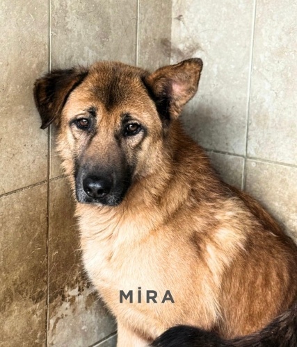 Mira – 3 yaşında. Dişi, sessiz ve zarif, sevgiye muhtaç. Bir barınağa terk edildi. Şimdi ücretsiz olarak yuvalandırılacaktır. Amerikan retriever / kurt melezi.