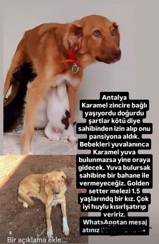 Kızımız karamel 1,5 yaşında kısırlaştırılıp verilecektir bulunduğu yerde kısa bir zincire bağlanıp yaşıyordu sahibinden izin alarak doğum ve emzirme süreci için pansiyona aldık yuva bulunmazsa eski yerine gitmek zorunda lütfen kızımız eski hayatına dönmesin ona sevildiği bir yuva bulalım sevecen cana yakın ve akıllı bir kız 30 yaş üzeri aile düzeni oturmuş kişiler ulaşsın lütfen