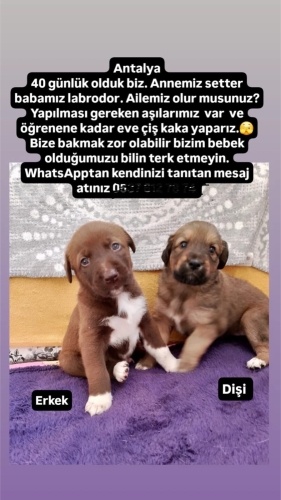 BEBEKLER 40 günlük erkek ve dişi karışık parazitleri yapıldı artık sütten kesildiler anne setter baba Labrador bu güzel bebeklere bir ömür yuva olacak bebek köpek eğitiminden anlayan sabırla ve sevgiyle onları büyütecek 30 yaş üzeri aile düzeni oturmuş kişiler ulaşsın lütfen. Geçici yuvada son günleri bir patidende sen tut