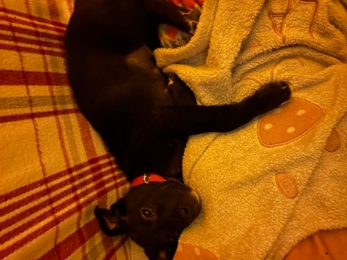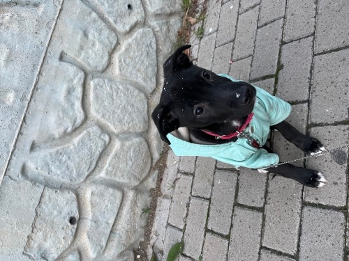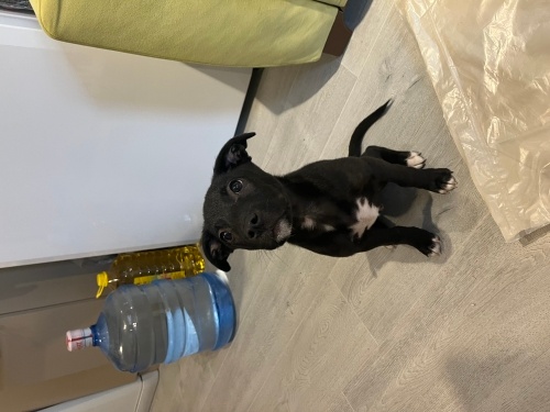 İncir 4–5 aylık, simsiyah, ince-uzun yapılı, muhtemel Labrador/koşucu tip kırması bir erkek yavru. Şu an ~6 kg, büyüyecek. Bir Golden kadar olmaz ama orta boy bir ırk olacak tahminen 15 16 kg kadar olur