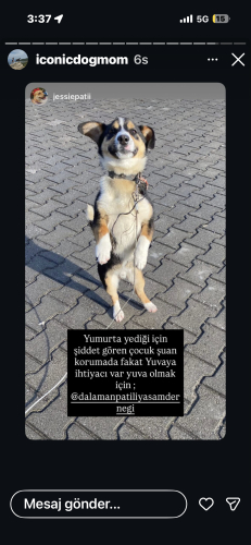 dalamandayız 1.5 yaş cıvarında şiddet gördügü yerden kurtarıldı şuan geçici yuvada ama artık lütfen onunde bir yuvası olsun havlama ısırma kovalama gibi huyları yok tuvalet egitimini oğreniyor cok sevecen 7-8 kg cıvarında sadece sevgi isteyen bir can