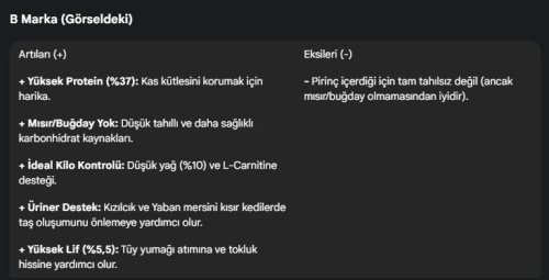 Ben bu içeriği hem beğendim hem beğenmedim. Protein ve yağın yeterli olduğunu düşünüyorum. İçerikte xxx proteini ibaresi yerine biraz da olsa xxx eti ibaresi beklerdim. Ancak bu fiyatlardaki diğer mamalarla kıyasladığımda ise yeterli olduğunu düşünüyorum.