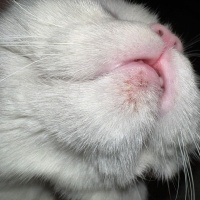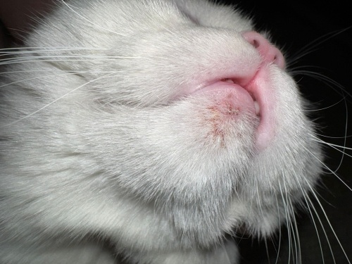Daha önceden bıyıklarının olduğu bölgede eozinofilik granülom sorunu yaşadığımız için bu dudağının alt kısmındakinin de granülomdan kaynaklanabileceğini, kortizonun son çare olduğunu, öncesinde 7 günlük çene aknesi kremi denemek istediğini söyledi. Verdiği kremi 7 gün boyunca kullandık, pazar günü bitti kremler. Ancak ikinci fotoğrafta görüleceği üzere sanki çene altı kabuklu yara oldu. Kremleri kullanmadan, yani 1 hafta öncesinde çene altında bu şekilde yara yokken şimdi bildiğiniz yara gibi.